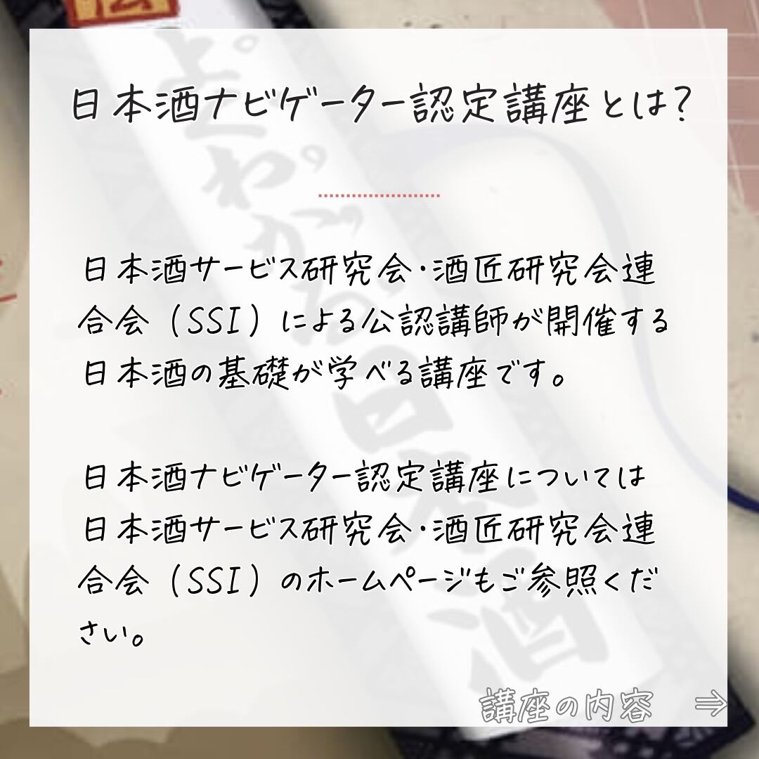 日本酒サービス研究会(SSI)の公認講師が開催する日本酒の基礎が学べる講座です。